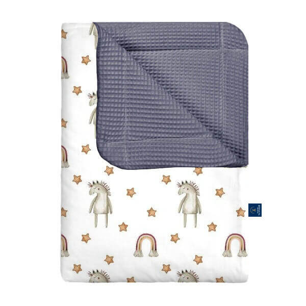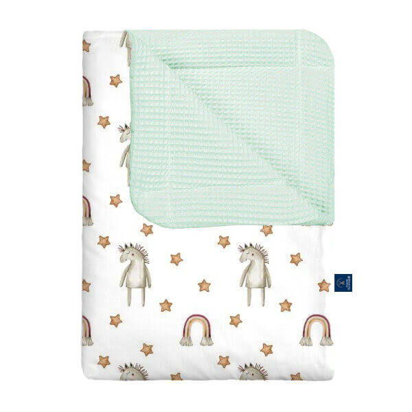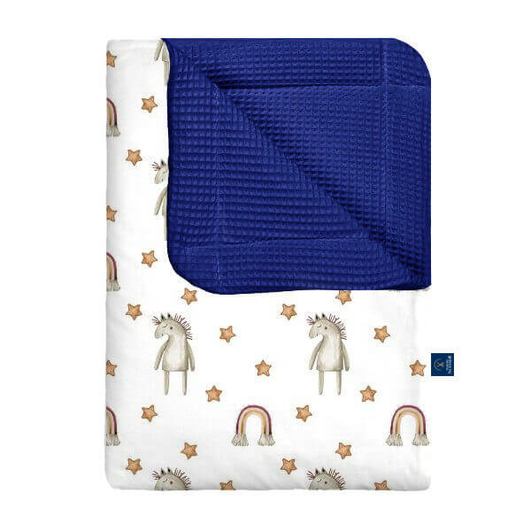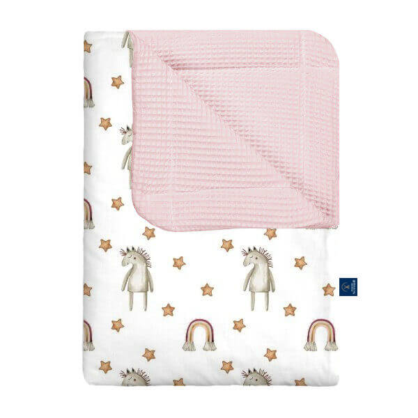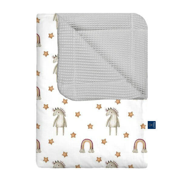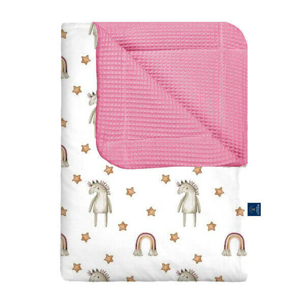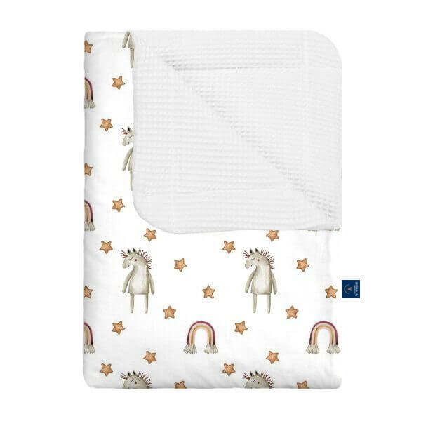Nasz kocyk wafel w kucyki to uroczy i kolorowy wybór dla małych miłośniczek koników. Wykonany z miękkiej, delikatnej bawełny wafelkowej, zapewnia dziecku komfort, ciepło i poczucie bezpieczeństwa podczas snu oraz codziennego odpoczynku. Wzór z kucykami dodaje kocykowi radości i bajkowego uroku, wprowadzając do pokoju przyjazną, wesołą atmosferę. Wybierając nasz kocyk wafel w kucyki, inwestujesz w wygodę swojego dziecka oraz praktyczny i stylowy dodatek, który otuli je każdego dnia.